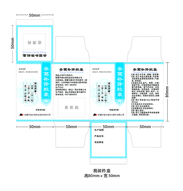 參葛補(bǔ)腎膠囊包裝制作項(xiàng)目 | 瓶裝包裝56粒 | 紙質(zhì)350克白卡,尺寸如下圖 | 制作方提供 |